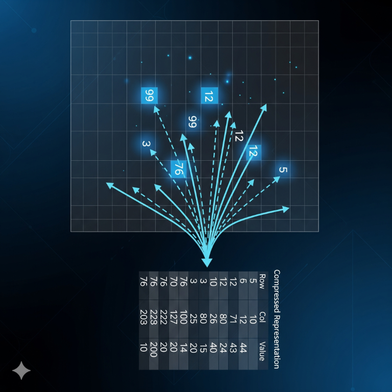展示了在 C 语言中实现稀疏矩阵压缩的完整流程:首先通过 inputMatrix 函数动态读取并存储任意大小的二维矩阵,再利用包含行列下标和元素值的三元组结构 TSMatrix 遍历原矩阵,把所有非零元素记录为紧凑的稀疏表示,并输出其位置与数值。