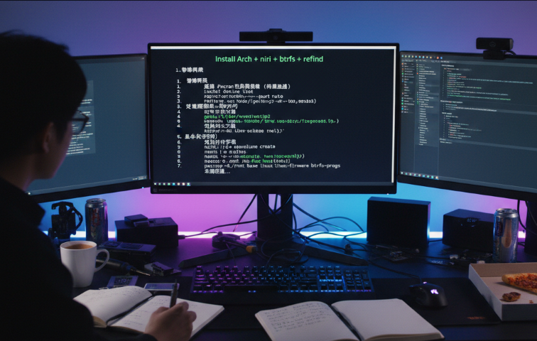 这篇博文记录了作者在全新设备上安装 Arch Linux 并搭建 niri 桌面环境 的过程,重点是 btrfs 文件系统 和 rEFInd 引导器 的配置。文章简洁梳理了从联网、镜像源优化,到磁盘分区、btrfs 子卷规划、分区挂载,再到 pacstrap 基础系统安装的完整步骤,并提供了关键命令示例。整体像一份可直接照做的安装手册,为后续 chroot 配置、桌面环境和引导器安装打下了基础。